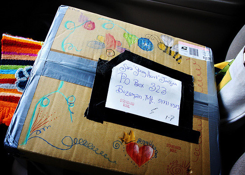 Decorate the OUTSIDE of the envelope/box as well! In the photo above, my friend Becky drew all kinds of goodies all over the box. You better believe everyone in the post office was jealous as it was handed over to me :) I like to put stickers and cut out magazine photos on the outside of envelopes...so much fun. Use modge podge for added effect. :)
