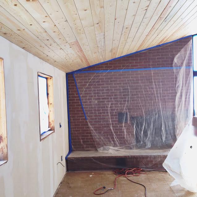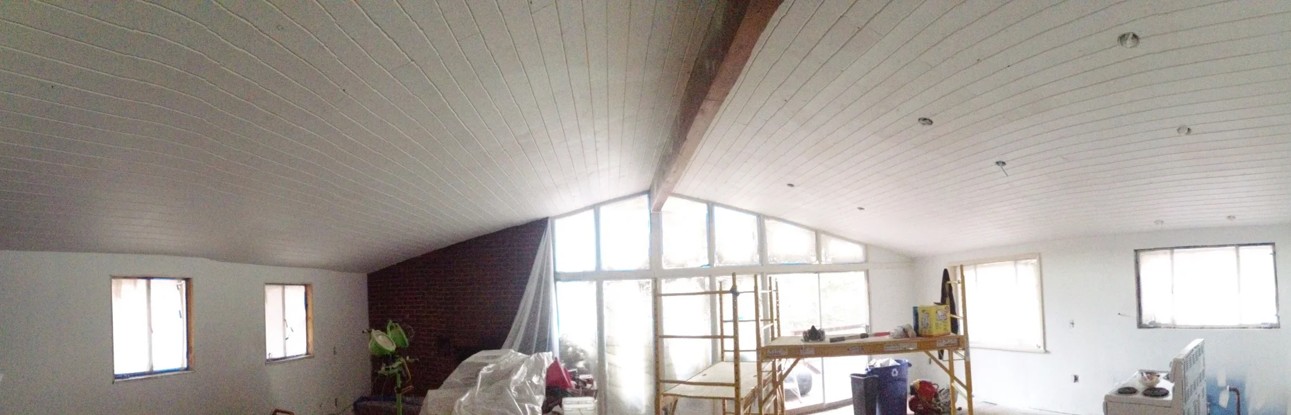 Sickness didn't keep us from pressing on with renovations! We finished the pine ceiling and prepped everything for our first coat of primer...applied with our paint sprayer.