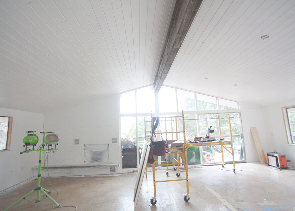 On Friday afternoon, Matt surprised me by finishing the barnwood beam in the living area! I LOVE it! He eventually also moved the scaffolding and all the demo trash outside the window...so now we have our unobstructed views back again. Open space. Windows. Yum.