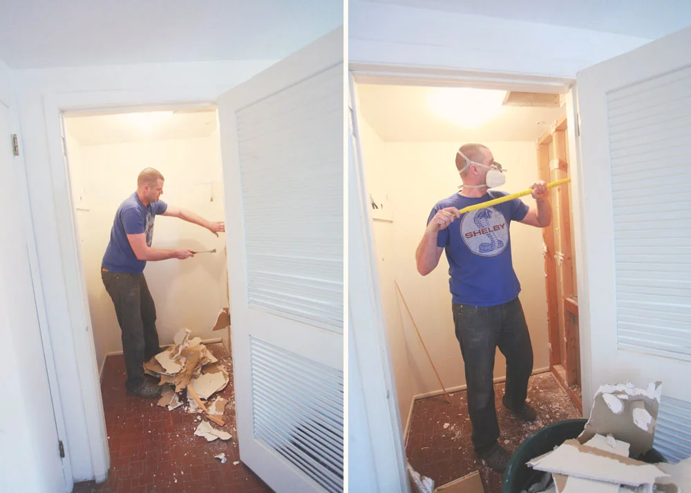 Our master bedroom only has a tiny toilet/sink room attached. But we really want to have our own shower. The adjacent art room and office just happens to have a huge closet that is the perfect size for a shower...separated only by one wall. So we knocked that baby right down! Weeeee!