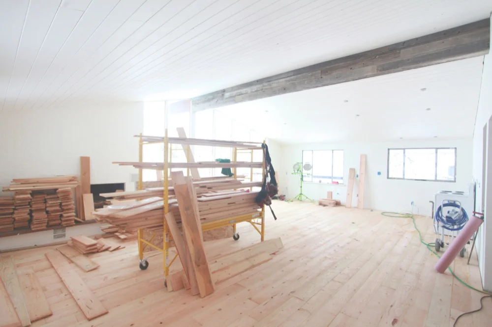 We now have all of the great room installed. The hallway is done as well...and the master bedroom is started. All we have left is the art room (finishing this weekend) and then we get to start sanding and sealing it up!