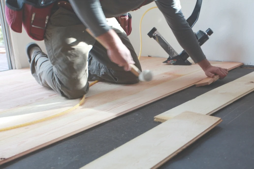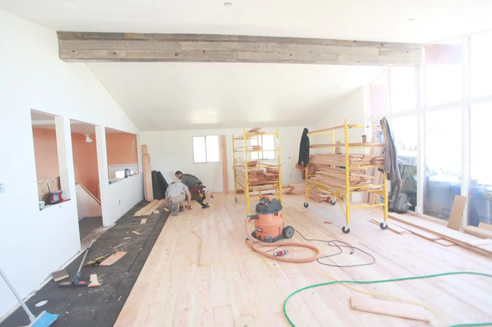 He decided to purchase the specialty nail gun made for flooring...after starting out with just a regular nail gun. So glad...because it went a lot faster after that! But boy oh boy...that thing is LOUD! Boom boom boom!