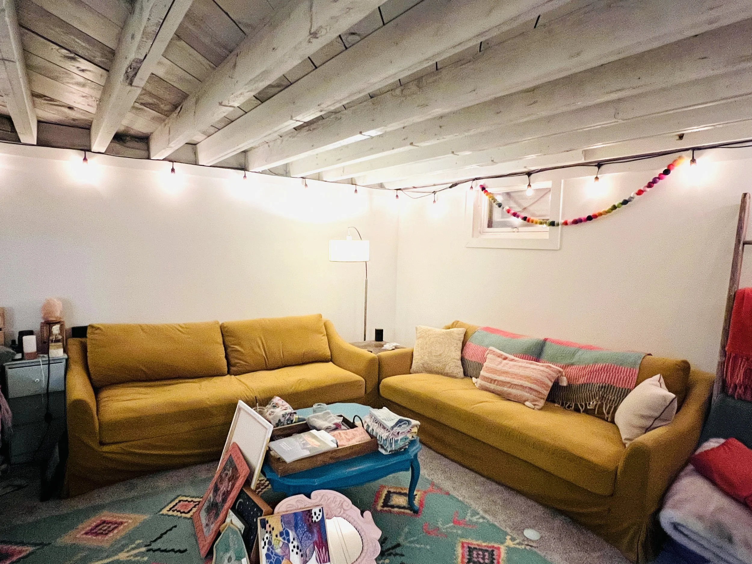 But look at it! Now I can’t believe we waited for so long…I get excited just to walk down the stairs now! These are IKEA Farlov couches with Soferia velvet slipcovers. The rug is the Berber Moroccan Diamond rug from RugsUSA.