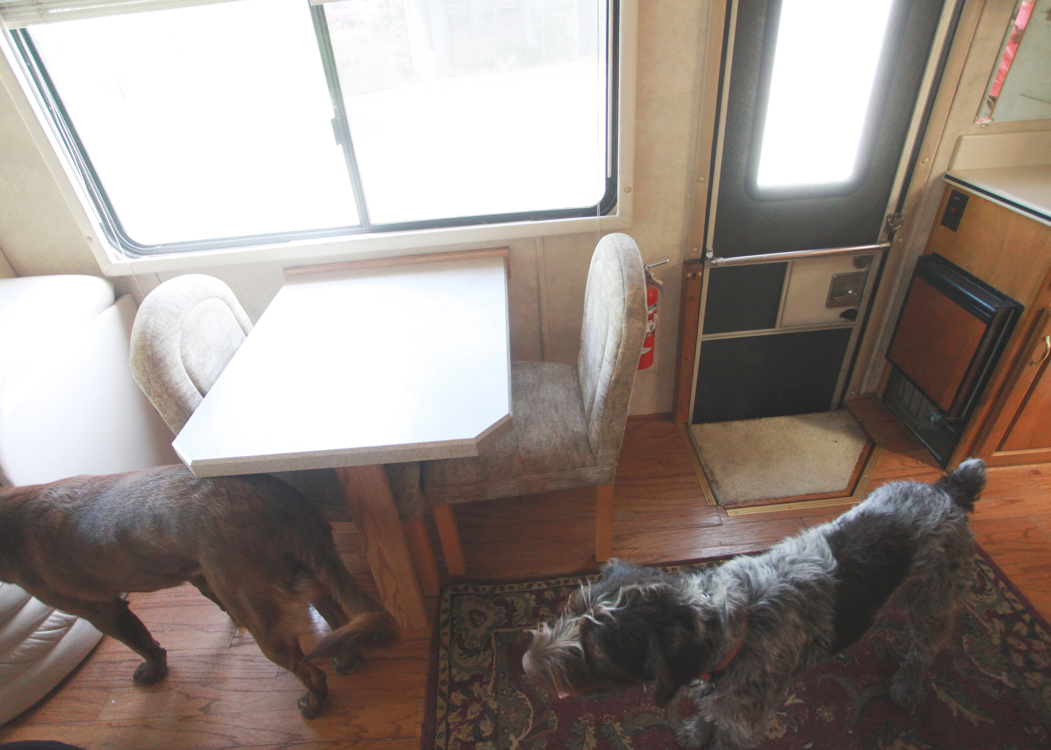 It's a mid-entry...which I love for many reasons. Mostly because I don't have to move all the stuff by my seat in the front for people to walk in and out. The table is small, but pulls out to add a leaf. We'll take out these chairs and add four small chairs or stools. And yes, that's an ice maker by the door. For my margarita dance par-tays. You know it.