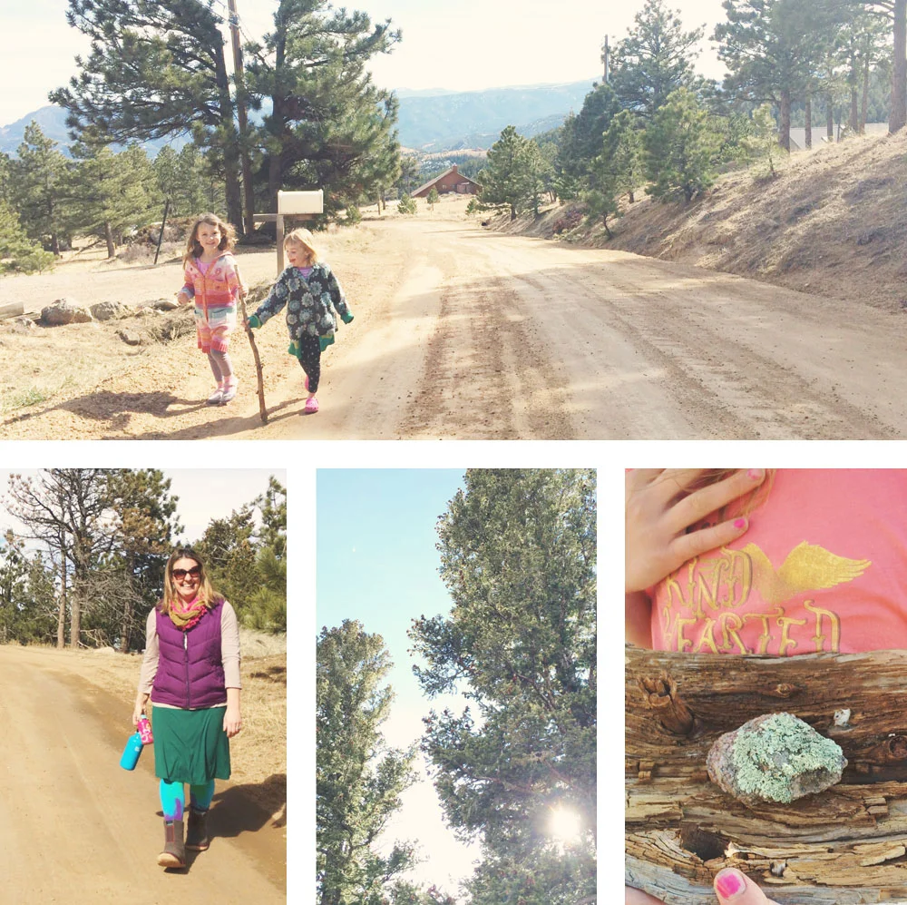We headed up the road to explore and hike a bit. The girls collected rocks covered with lichen and climbed light-drenched trees while Jen and I made plans to visit Golden and paint hiking sticks together.