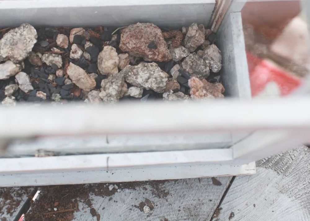 The first layer of the terrarium is a drainage layer...because your terrarium won't have holes in the bottom. We just went outside and gathered some rocks from our yard. On top of that, add a thin layer of charcoal (you can find this at a pet store or your local hardware/gardening store). The charcoal is important and will help keep your roots from rotting by filtering out excess moisture and will keep musty smells at bay.