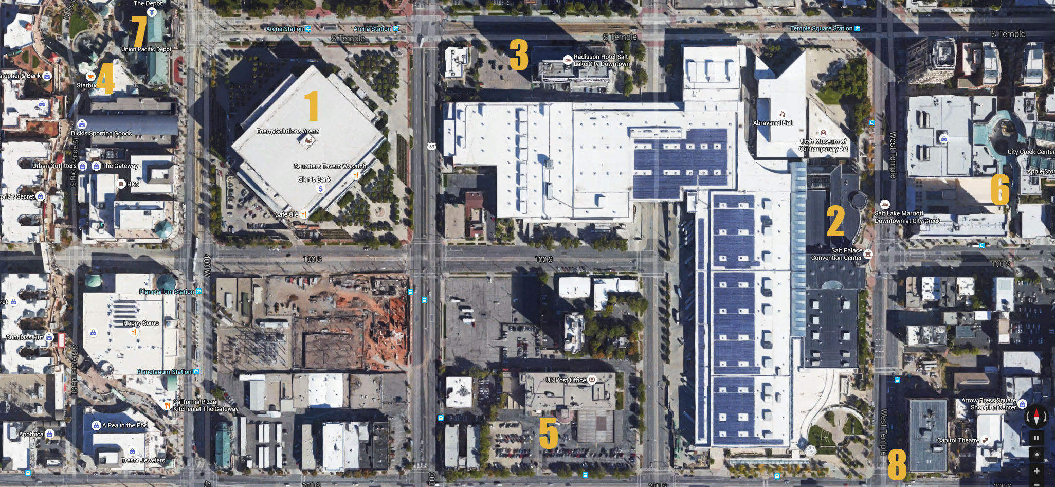 West Lot – Enter off of 300 West between 100 South and South Temple (400 stalls)